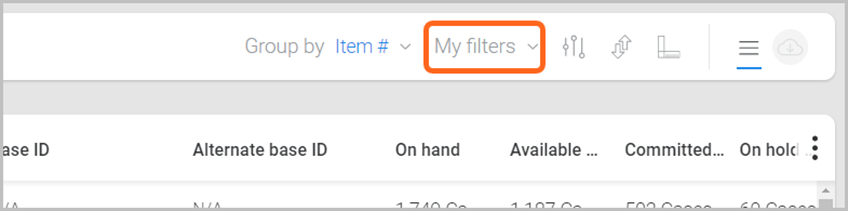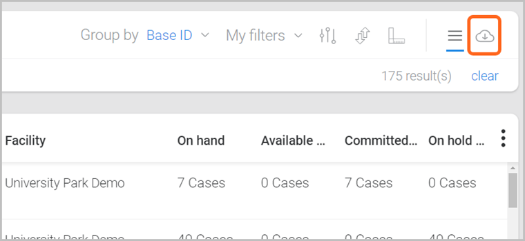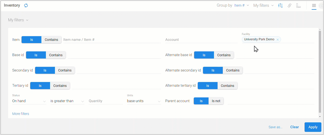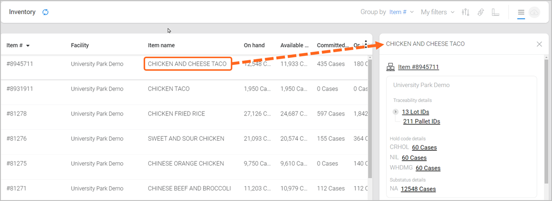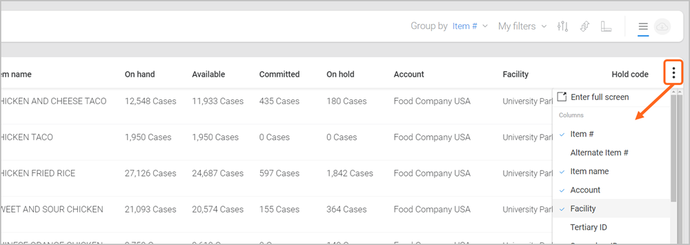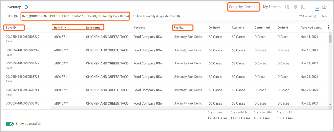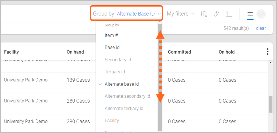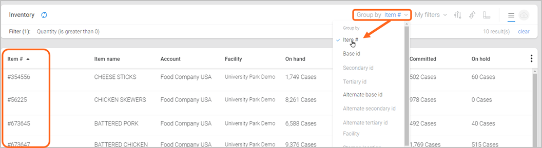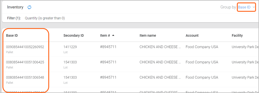 Located at the top-right of the Inventory page, is a ‘Group by’ menu, with options to view information based on how you track your item quantities (e.g., by Facility/Pallet ID/Lot ID). Note: Grouping options can vary based on other filters that are selected.