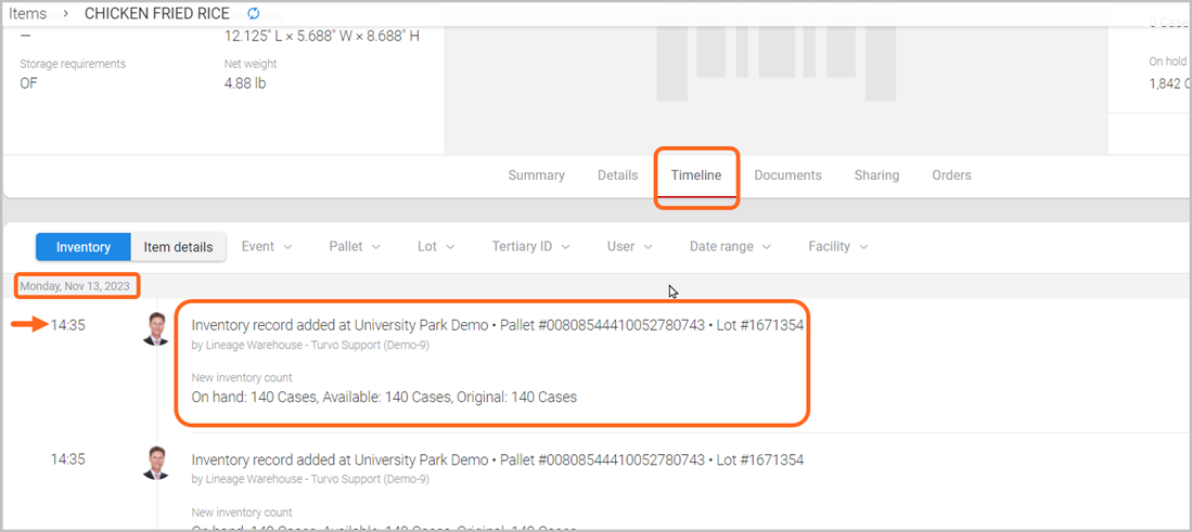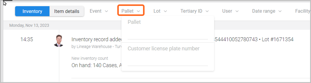 As needed, select a filter option at the top of an item Timeline and enter in the appropriate reference to narrow down specific events (e.g., Pallet ID).