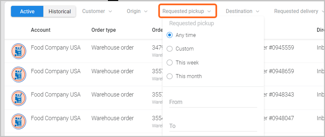 As needed, apply a filter option to narrow down one or more orders. For example, to narrow down orders that you originally requested to be picked up from Lineage within a certain date range, select the Requested pickup filter and choose or enter a date range.