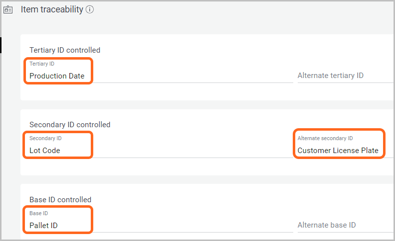 For example, within Item traceability, you can see how each ID is set up for an item depending on the way it is tracked (e.g., Tertiary ID is set up as the ‘Production Date’ on this item). Note: The associated columns on your Inventory page, will reflect the same information you see set up here.
