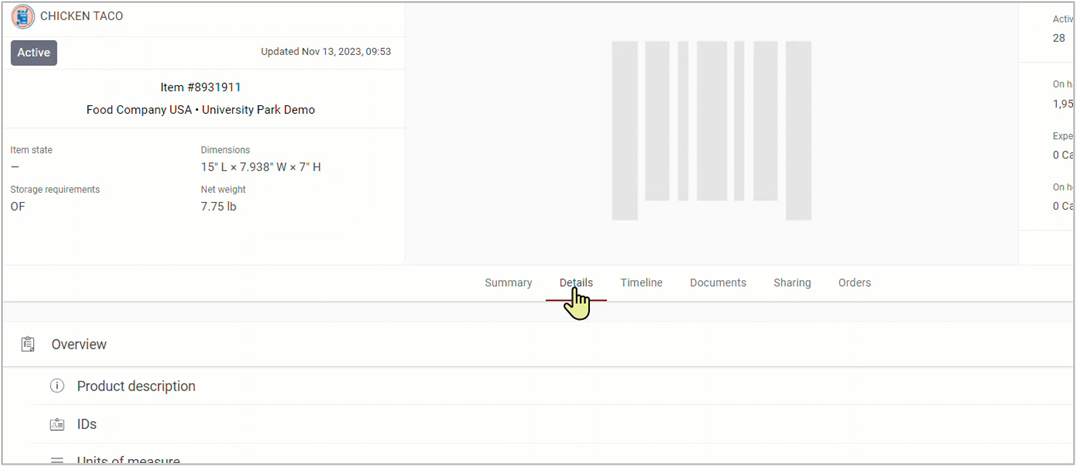 To view item description, dimensions, weight, or storage requirements that were recorded upon initial setup, click the Details tab and select a segment within the Overview section to expand the details.