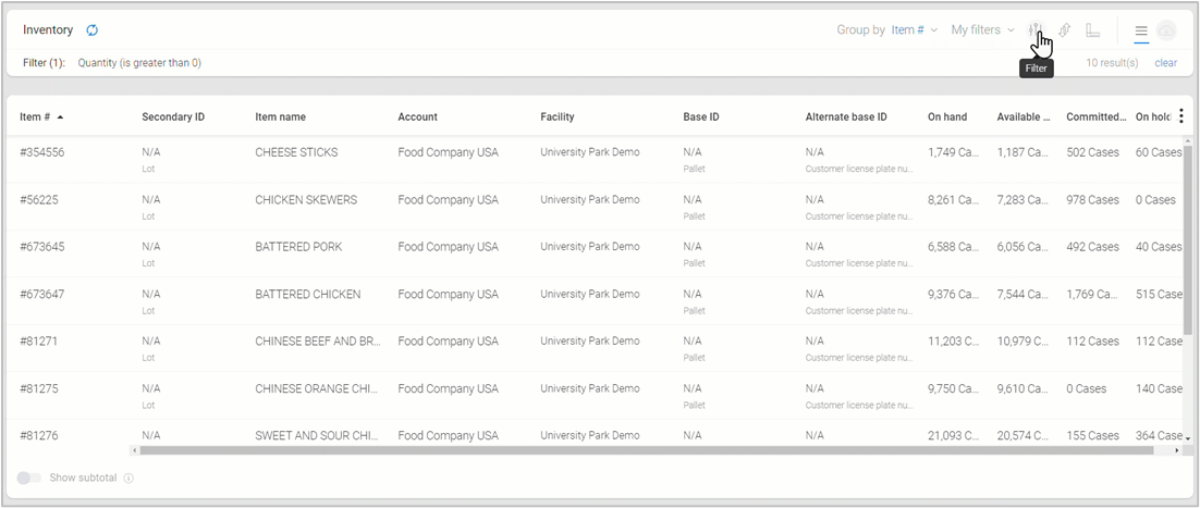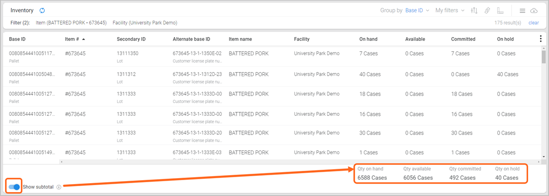 To display a total of on hand quantities, select the Show subtotal toggle (bottom-left). Note: A filter or group by option may need to be applied first to narrow results before viewing the subtotal.