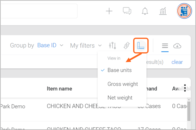 To view quantities in another unit of measure, click the ruler icon and select one of the ‘View in’ options listed in the drop-down menu (definitions below).