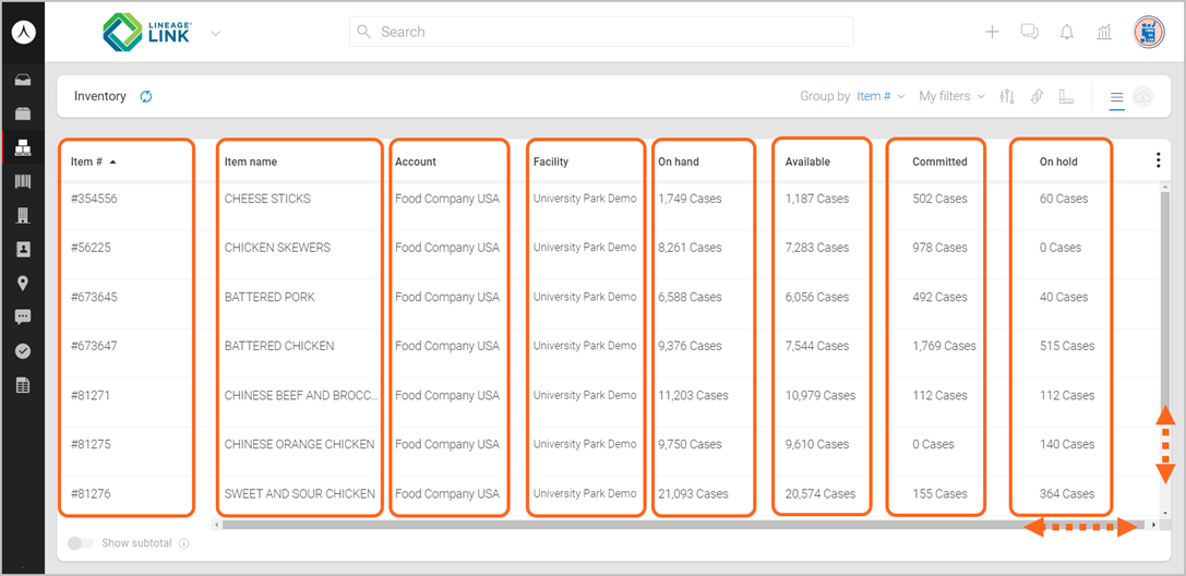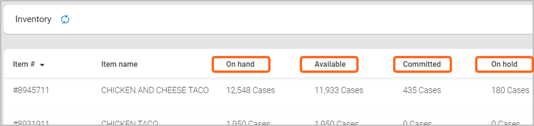 - On hand: The total quantity of this item at a Lineage facility. On hand totals are made up of the Available, Committed, and On hold quantities.
