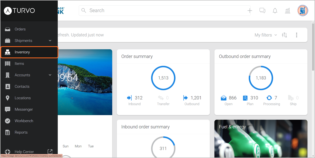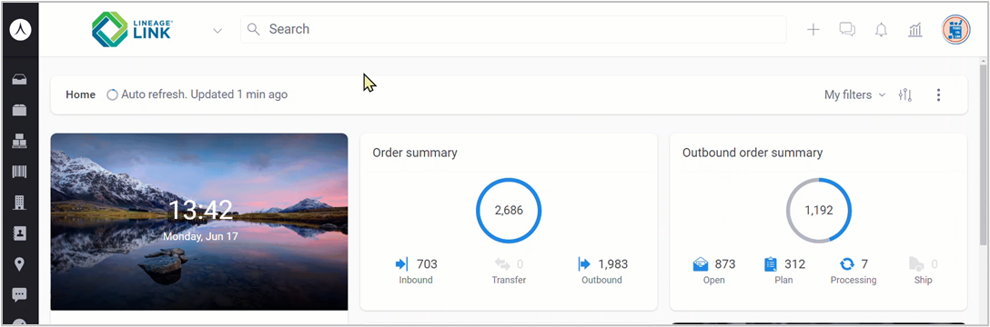 - Inventory: Provides you with an overview of recent changes to inventory at a Lineage warehouse location (e.g., Inventory added, count changed, holds).