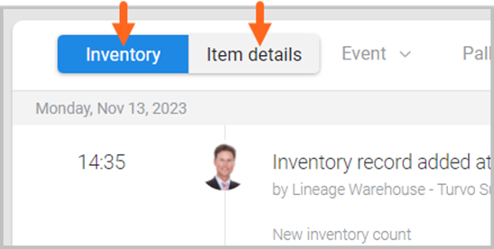 The item timeline gives you the ability to toggle between different types of history by selecting Inventory or Item details.