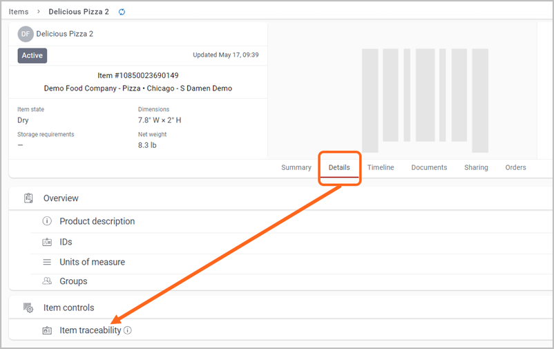 To view how reference IDs for an item are set up, click the Details tab and select Item traceability to expand the segment.