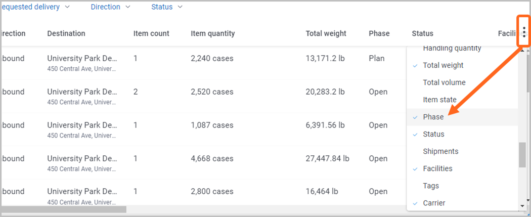 As needed, click the 3-dots icon and select the columns you’d like to display/hide.