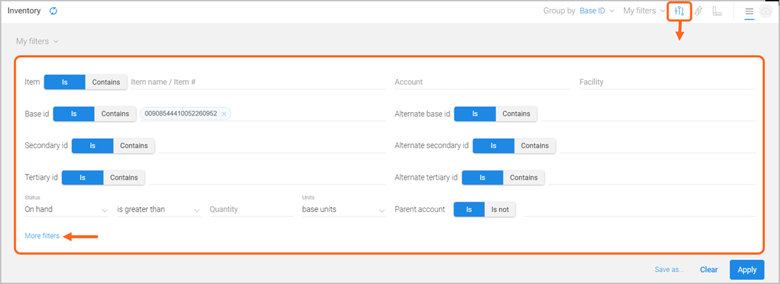 As needed, click on the Filter icon to view the rest of the fields that you can use to narrow down the inventory list and search for key information. Select More filters to see additional criteria (e.g., Hold code, Received date).