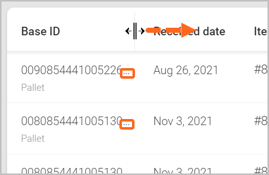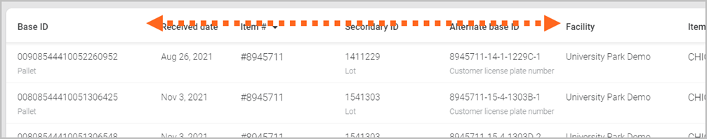 - Re-arrange a column: Click a column header then drag and drop it left or right. Note: The first column cannot be moved and will remain as the primary column the data is prioritized by, depending on how you have selected to view/group information (e.g., by Item ID/Pallet ID).