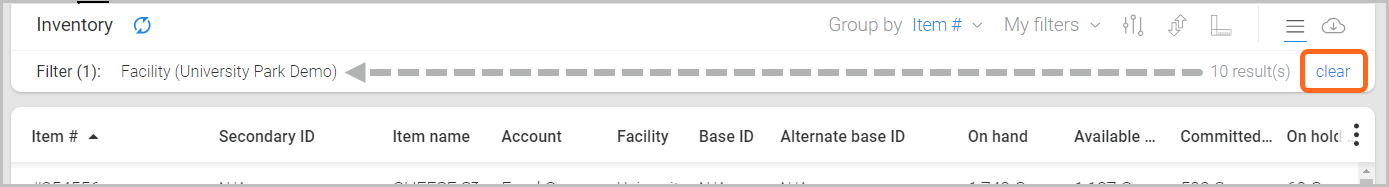As needed, click clear to reset your inventory page back to the default view of all items. Otherwise, the previously used filter will remain applied to the page as you navigate, and will also remain applied for the next time you sign in.