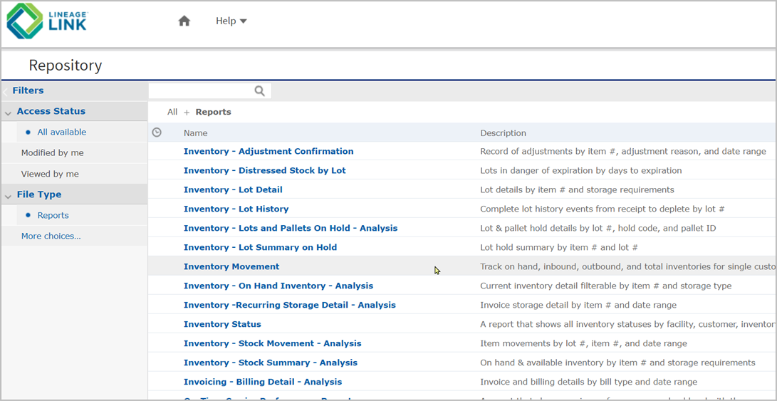 Select an inventory report name to access it, then choose the information you need to run the report data for. For additional information, see the Lineage Reports learning path.