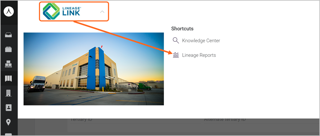 Clicking on the Lineage Link logo (top-left) will expand the shortcuts menu. Click on Lineage Reports to open the reporting page. Note: Report availability will vary depending on the facility.