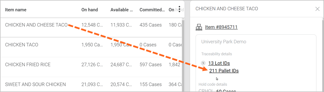 Clicking on a link within the right-hand-pane of an item will take you to a breakdown of item quantities based on the ID or reference selected. For example, selecting # Pallet IDs will group all the on hand quantities for the item selected, and break them down by each pallet ID.