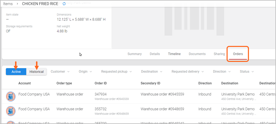 To view what orders an item was placed on, select the Orders tab and toggle between Active or Historical. Also, if needed, click on an Order ID to go directly to its summary and any available details (e.g., line-item detail, Lineage warehouse shipment-related events, documents).